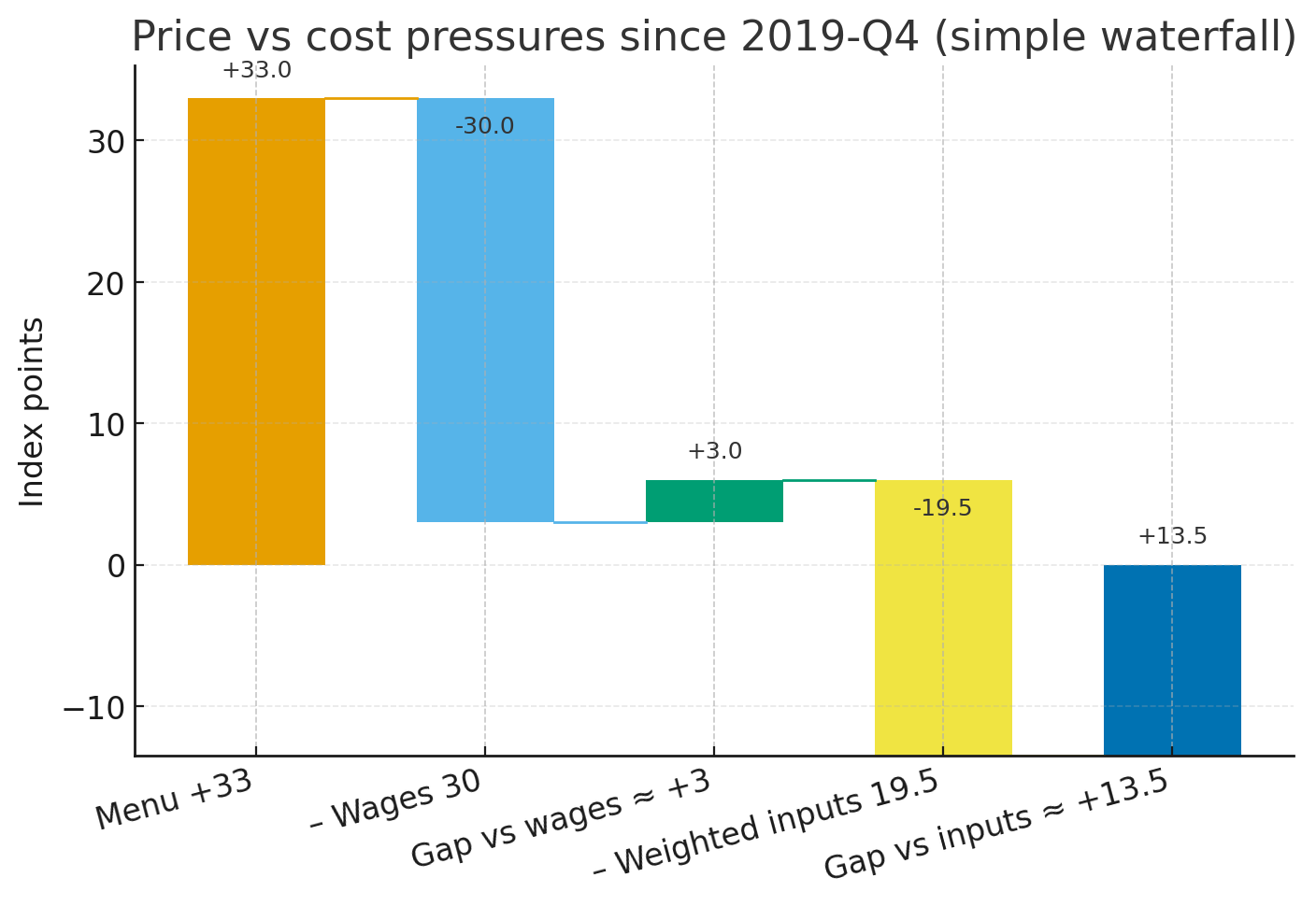Rebasing: All series compared conceptually at 2019-Q4 = 100; your supplied figures (e.g., ~+33% menu, ~$29.7/h wages by 2025 Q2) anchor the analysis.