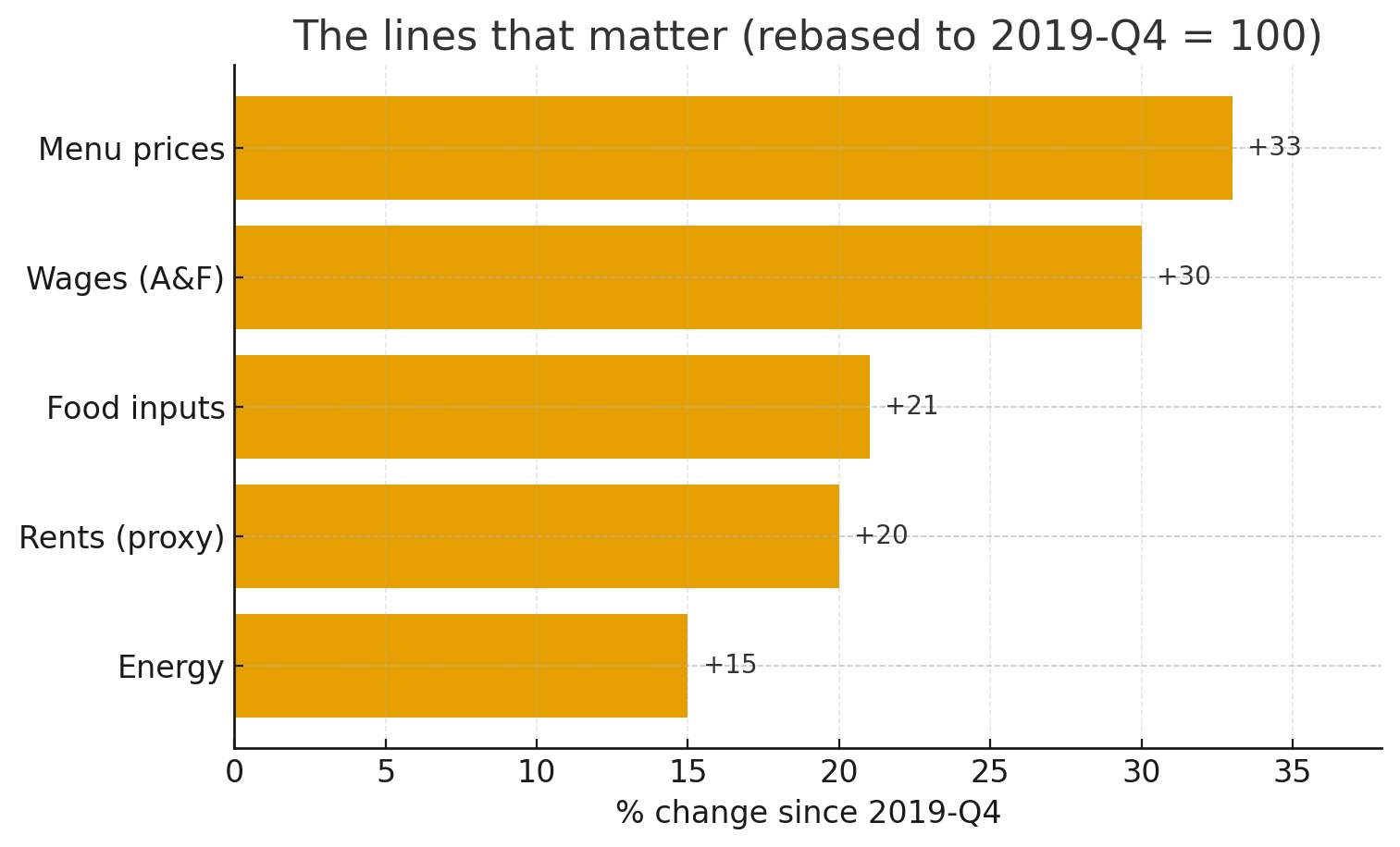 Menu prices (CPI “restaurant meals & ready-to-eat”): ~+33% from late-2019 to mid-2025, with 8–12% annual bursts in 2022–23 as costs spiked.
